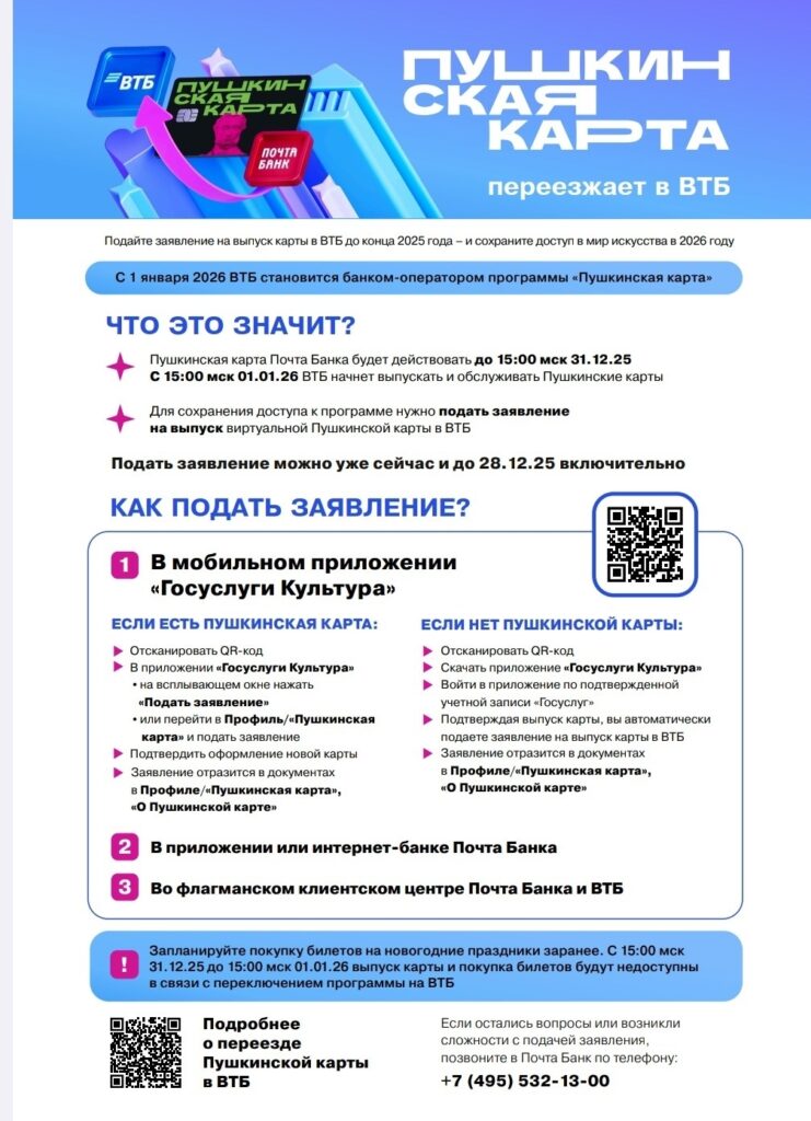 В связи со сменой банка-оператора Пушкинской карты 1 января 2026 г., сообщаем информацию для держателей карты по действиям, необходимым для её выпуска в банке ВТБ.